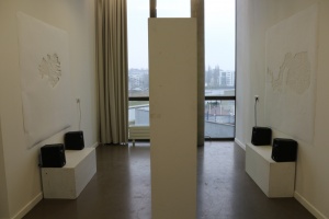 Pour l’installation de mon projet, j’ai voulu tenter de recréer une ambiance, une atmosphère de marche ou de voyage qui pourrait se rapporter à mon trajet quotidien. Pour ce faire, j’ai accroché mes deux découpages de ville sur deux murs, l'un en face de l'autre. J'ai ajouté entre les deux une grande cimaise faisant office de mur pour les séparer. Le spectateur pourra donc se trouver soit face au plan de Paris, soit face à celui de Caen. Deux paires d’enceintes, positionnées à côté de chaque plan diffusent le montage réalisé à partir des prises de sons sur chacun des parcours. Tout ceci sera réalisé dans une salle d’accrochage fermée, afin de limiter les bruits parasites provenant de l’extérieur. Le spectateur se retrouve donc plongé de manière visuelle et auditive dans l’ambiance de mon parcours quotidien. Les vidéos des stop motion seront visibles, ainsi que mes recherches personnelles, et mes références sur une table de l’autre côté de la pièce.