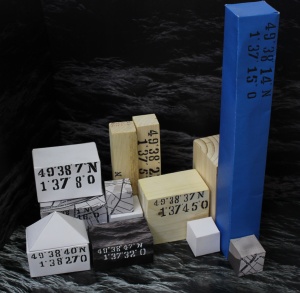 Ma propre vision de Cherbourg, c'était de rassembler tous les éléments qui pour moi se rapportaient à cette ville, les lieux auxquels je pense directement quand je pense à celle-ci. J'ai donc créer des blocs, simplifiés, déjà par leurs formes rectangulaires ou carrés, mais aussi par leur manque d'identification possible. Il y a simplement la latitude et la longitude inscrit sur chacun d'eux. Ces endroits vont du port à des immeubles, passant par la piscine ou la gare de Cherbourg. Ils sont présentés sur un fond et un sol d'une photographie de la mer en noir et blanc. J'ai voulu montrer la place que celle-ci avait pour cette ville, que l'eau avait une grande importance et pouvait même prendre le dessus. Les blocs sont placés de façon à ce qu'ils soient proches, presque encastrés les uns dans les autres. Cette proximité pour moi me rappelle une atmosphère dans la ville. Une sorte de concentration créant « un confinage » à l'intérieur.