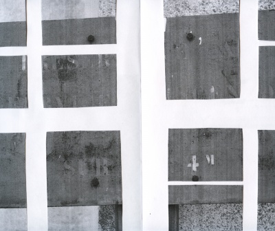 J’ai utilisé comme base à ce travail, le cadastre de la presqu’île. Pour en perturber la lisibilité, j’y ai superposé des bandes blanches horizontales et verticales.