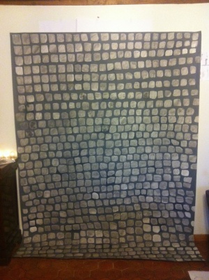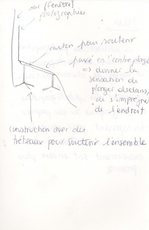 Le but de mon projet est de parvenir à donner au spectateur le sentiment de visiter Caen. Je souhaite que le spectateur ressente le fait d'être imprégné du rythme de la ville à travers les photographies, la bande sonore ainsi que le dessin. Ce dernier représente les pavés du centre ville qui, selon l'installation, viennent s'entasser aux pieds du spectateur, lui donnant ainsi la sensation de faire corps avec la ville. En me posant à différents quartiers du centre ville je souhaite démontrer que l'urbanisme influence la déambulation : les distinctes ambiances de la ville enveloppent, malmènent ou retiennent le piéton.