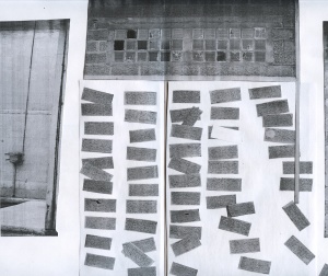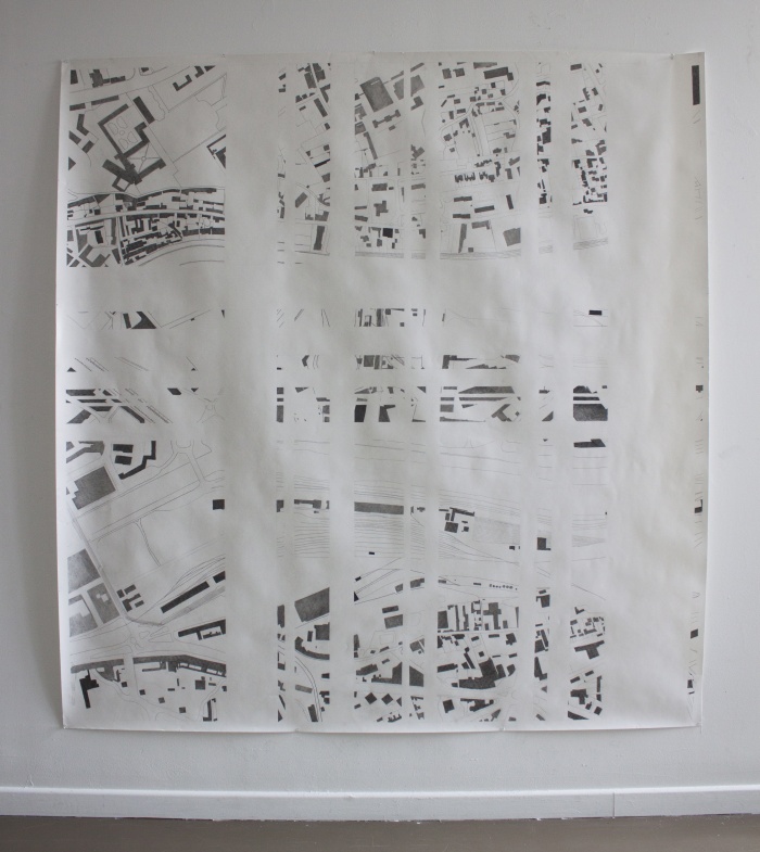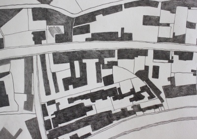 J’ai utilisé comme base à ce travail, le cadastre de la presqu’île. Pour en perturber la lisibilité, j’y ai superposé des bandes blanches horizontales et verticales.