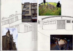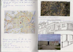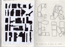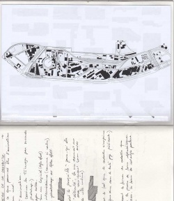 Départ de réflexion. Croquis. Observation à travers différents types de cartes. J'organise mon travail de la manière suivante; n'ayant pas d'idée immédiate de fiction, je choisis de faire des recherches de manière générales. Je réfléchis donc dans un premier temps aux cartes qui peuvent m'intéresser, de manière graphiques et plastiques. Je passe par différents modes de représentations, j'écris beaucoup surtout, je dessine, j'utilise les photos prises, bref, je recherche. Finalement, mon intérêt se porte sur le cadastre. Cette carte où juste les bâtiments sont représentés de manières simplifiés, en noir et blanc. Cela ajoute du mystère à cette presqu'île. Découvrir des formes de bâtiments qu'on ne soupçonnait pas.