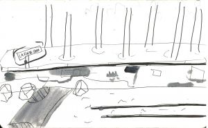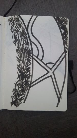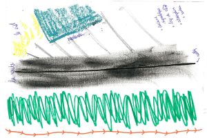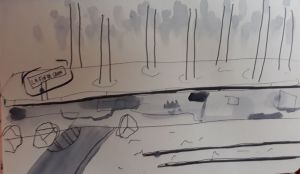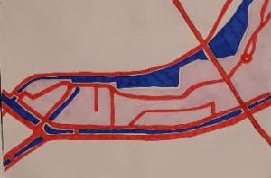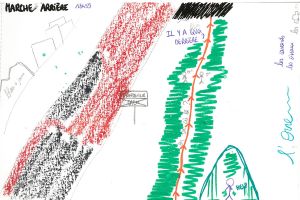 Au cours d'une sortie sur la Presqu'île de Caen, impossible de ne pas passer par le Cours Caffarelli et s'arrêter à la vue des magnifiques allées d'érables bordant l'Orne. Ce paysage bucolique pourrait inviter à la contemplation et à la rêverie si l'on n'était pas constamment dérangé.e par les passages incessants des camions et voitures qui traversent la Presqu'île avec vitesse et cacophonie. Si l'on s'y penche d'un peu plus près, le lieu, loin d'être un écrin de verdure en bord de rivière, pourrait presque sembler hostile : bourdonnement de fond provenant de la circulation sur le Viaduc de Calix, vrombissement des moteurs traversant la Presqu'île, absence criante de trottoirs et de signalisation, passages piétons qui ne mènent nulle part, odeurs de pétrole... Notre première approche de l'endroit a été marquée par ce trop plein de stimuli, qui submergent les sens et peuvent empêcher d'appréhender le Cours Caffarelli comme un lieu de promenade. On y croise pourtant de nombreux.ses piéton.nes, des promeneurs.euses avec leurs chiens, des groupes de course, des prostituées et des habitant.es des squats tout proches - preuve qu'il a gardé son rôle originel de promenade. Au fil de notre travail, nous avons donc tenté de démêler toutes les trajectoires qui traversent, franchissent ou encore survolent ce Cours Caffarelli