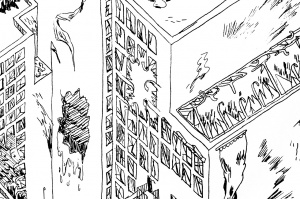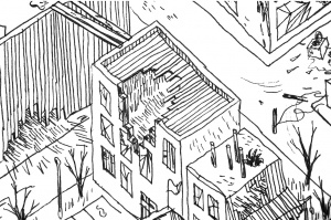 Avant de démarrer le dessin de la ville j'ai tracé un cadrillage sur la feuille avec des angles à 45° afin de reconstituer la représentation que l'on a des villes sur Google Earth. Puis est venu le dessin, réalisé au feutre fin noir, le format de la ville est des 100x100cm.